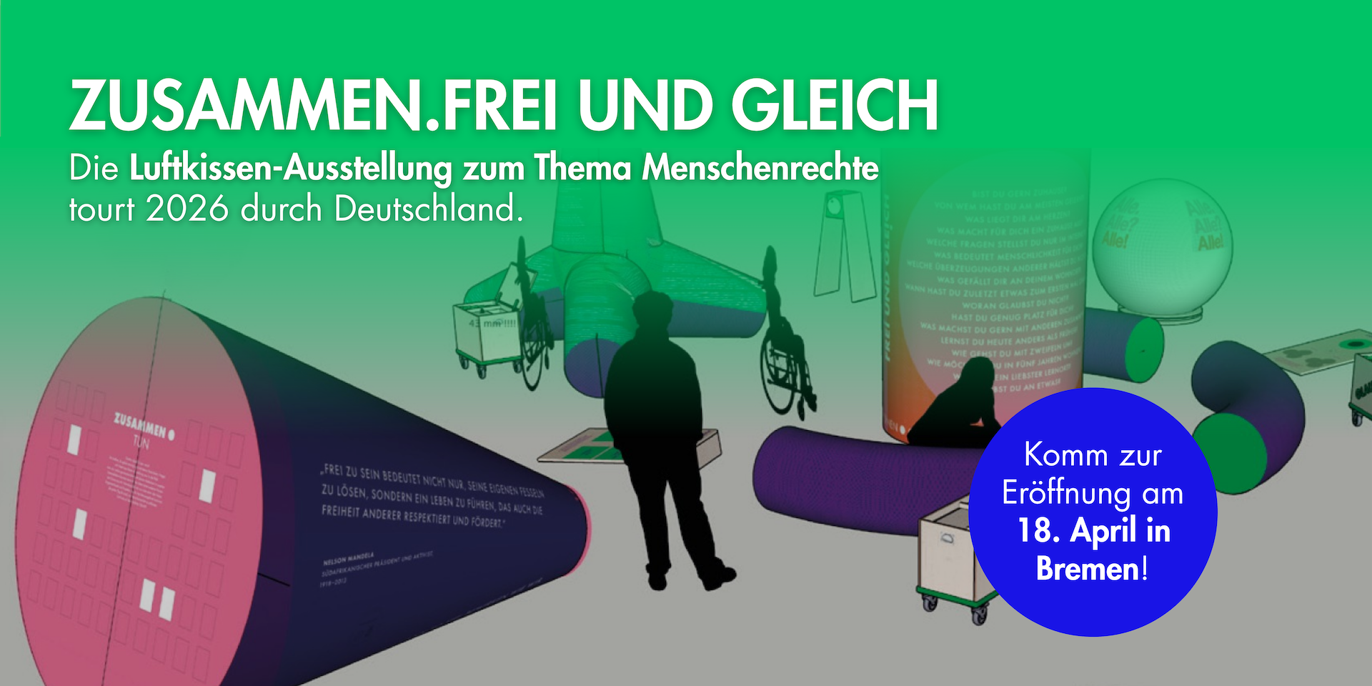 Die Ausstellung ZUSAMMEN.FREI UND GLEICH ist die erste Luftkissen-Ausstellung zum Thema Menschenrechte. Im Mittelpunkt steht die Frage, wie wir Räume, in denen wir ZUSAMMEN.LEBEN – wohnen, glauben, lernen – so gestalten, dass Freiheit und Gleichheit möglich sind. Dazu gehören auch ZUSAMMEN.WACHSEN und ZUSAMMEN.AUSHALTEN.